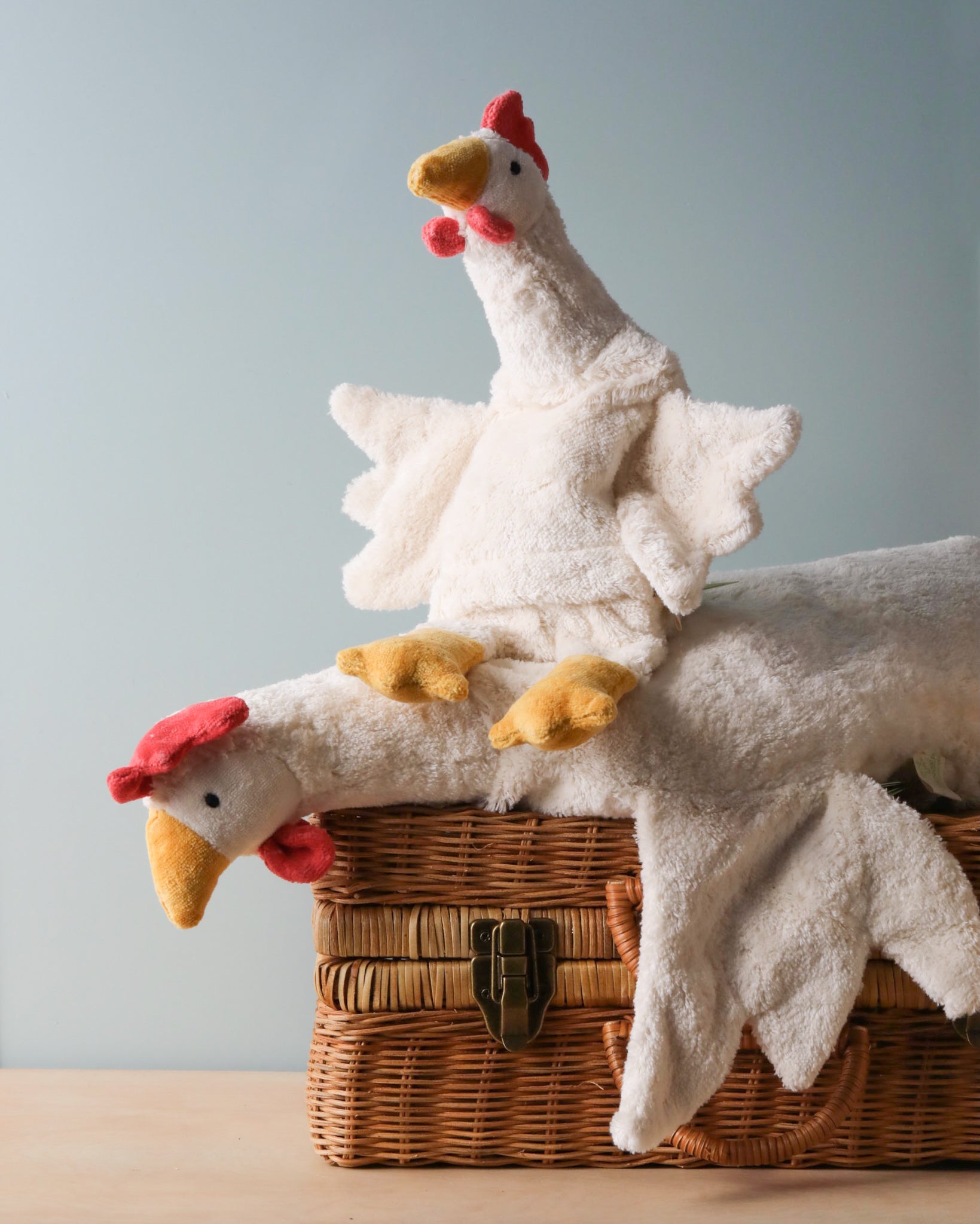 Handmade in Germany by Senger Naturwelt, this cuddly Chicken doubles as a gentle warming pillow. The head and feet are filled with lamb wool and the outer layer is made with organically grown cotton. The tummy features a removable bag filled with natural spelt or grape seeds. The bag can be warmed up in the oven at low temperature (do not microwave) or put it in the freezer to cool special parts of your body.